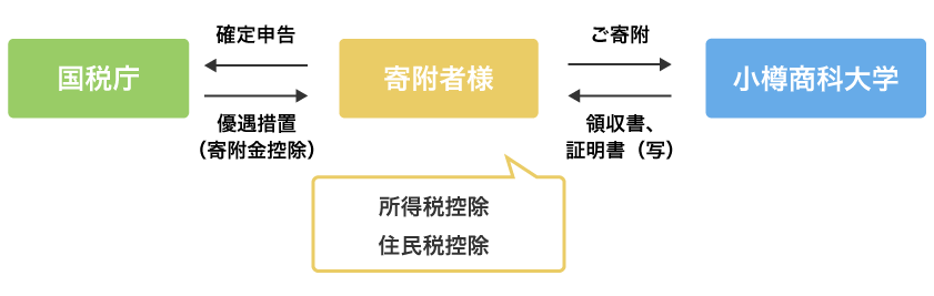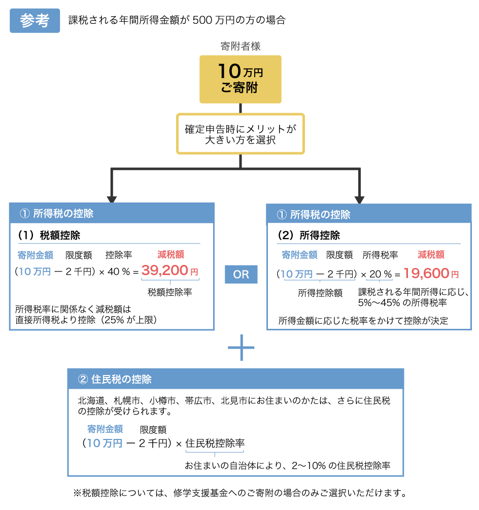 本学に対するご寄附は、寄附金控除として、「所得控除」の対象となります。また、修学支援基金へのご寄附については、「税額控除」の対象となり、確定申告の際に、寄附者様において「所得控除」または「税額控除」のいずれか一方の制度をご選択いただけます。さらに、お住まいの地域によっては、住民税の寄附金税額控除を受けることができます。